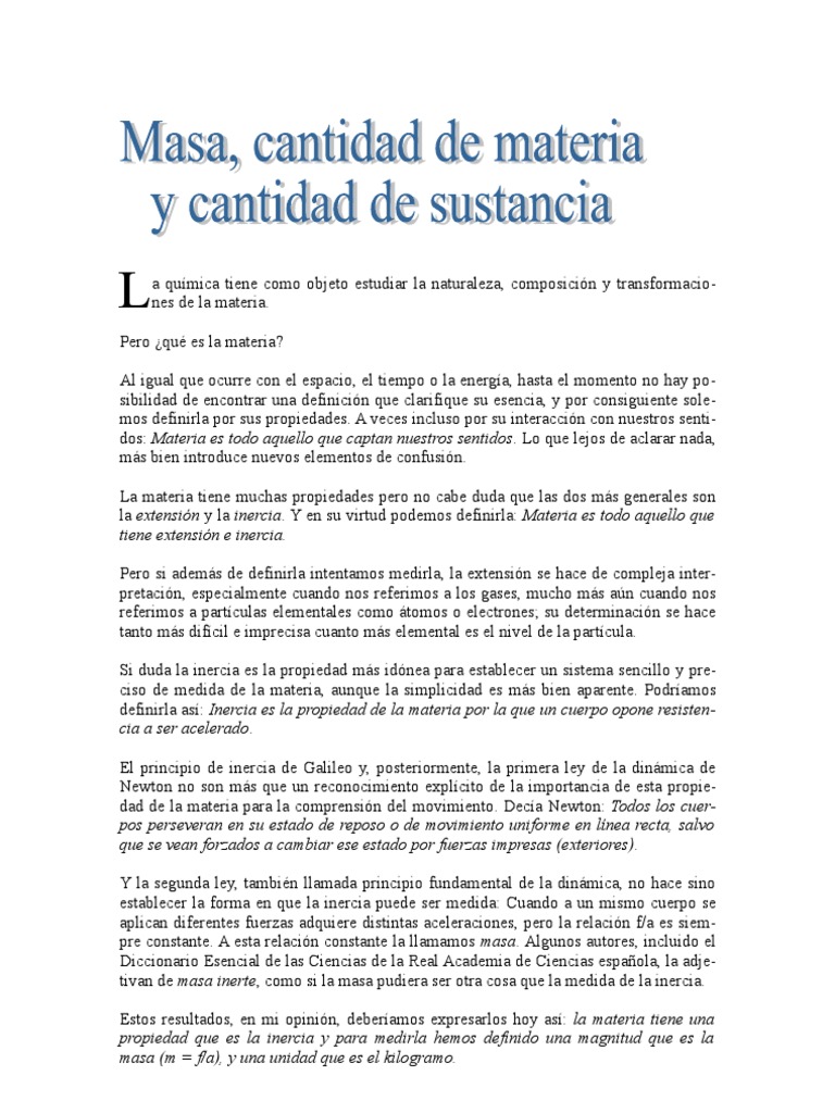La masa inercial es la medida de la resistencia que ofrece a cambiar su estado de reposo o movimiento llamado inercia. Es decir que tanta fuerza de atraccion tiene la tierra sobre el mismo. Materia es todo lo que tiene masa y ocupa un lugar en el espacio. La masa es la cantidad de materia o cantidad de particulas atomos iones o moleculas que posee un cuerpo y se mide en unidades de.