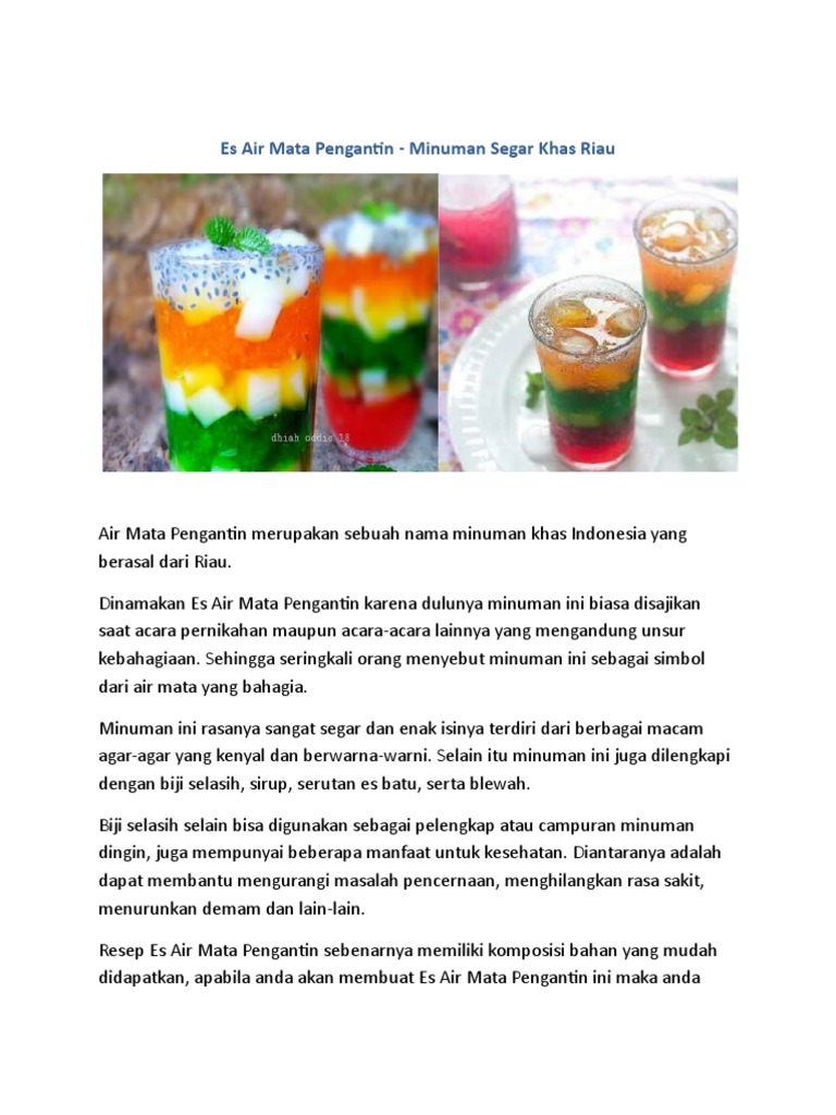 Es air mata pengantin terdiri dari bermacam agar agar berwarna warni. Es air mata pengantin terdiri dari bermacam agar agar berwarna warni. Daerah ini merupakan salah satu tempat di indonesia yang memiliki ragam minuman khas yang cukup bervariasi. Saat tenggorokan sedang kering es air mata pengantin siap menjadi penyejuk yang bisa melepas dahaga.