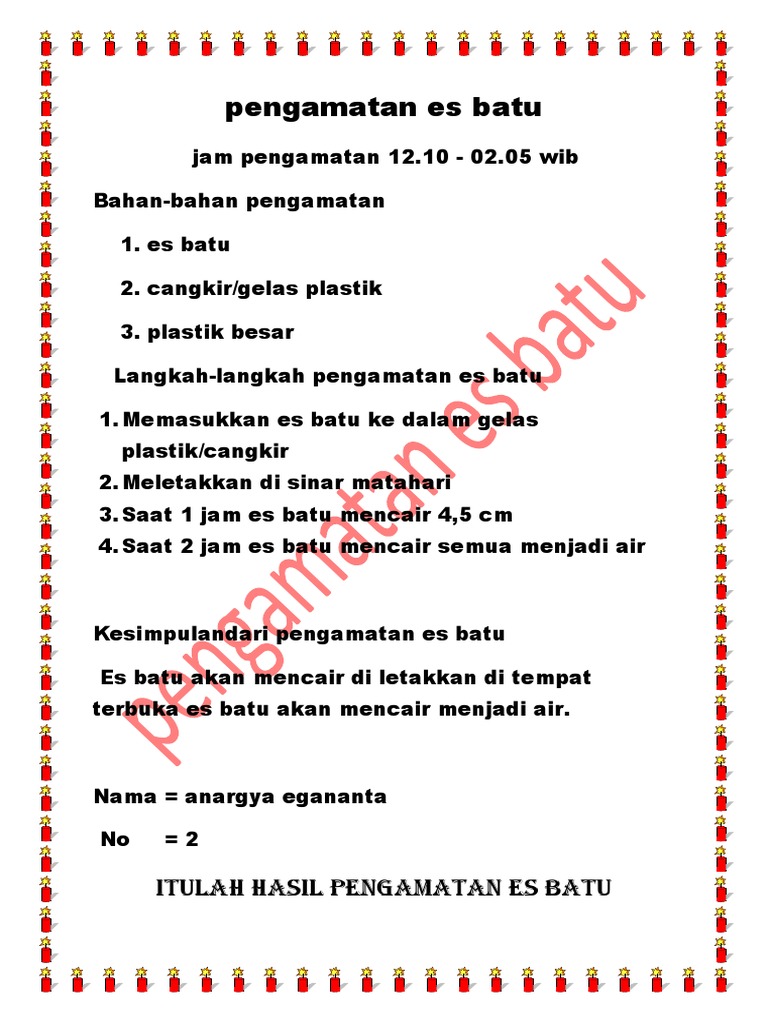 Ayo membaca mencair hari ini sangat terik. Kalau masih ada sisanya simpan saja es tersebut di dalam termos khusus es supaya tidak cepat mencair. Pangamatan amatilah perubahan yang terjadi pada es batu tersebut selama percobaan berlangsung dan catatlah dari waktu ke waktu. Letakkan es batu pada gelas beaker.