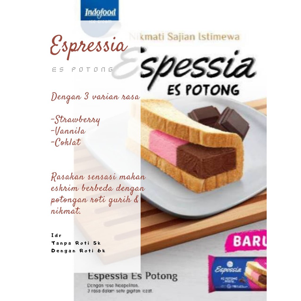 Es krim espessia potong. Jual es potong espotong espressia indoeskrim dengan harga rp80000 dari toko online yolaroromendut tangsel jakarta timur. Harga promo rp40990. Harga promo rp39990. Promo indoeskrim espessia es krim di tip top.