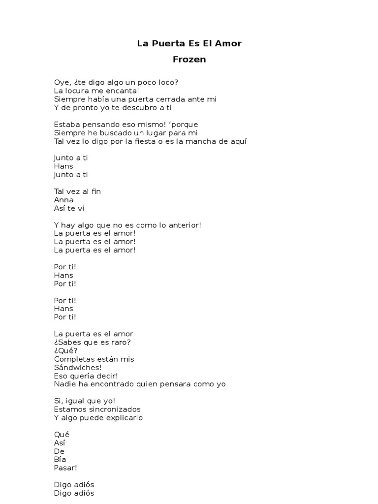 Representa la inocencia y fantasia infantil de las hermanas elsa y anna cuando eran. Por favor no cierres la puerta no tienes que alejarte mas. La puerta es el amor frozen en latino letra. Por favor no me ignores de nuevo.