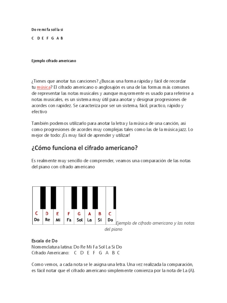 O dicho de otra manera aquellos sistemas que no utilicen los simbolos particulares de la notacion musical convencional a traves del pentagrama para expresar los eventos. El cifrado americano surge de la necesidad de hacer mas facil la lectura de las notas ya que leer partituras es un poco mas complejo y lento por lo cual se requeria escribir y leer notas de manera rapida facil y comoda. El cifrado americano es conocido como cifrado internacional. A esta forma de escribir la musica se le llama cifrado americano anglosajon o internacional en este cifrado se utilizan las letras del abecedario de la a a la g.