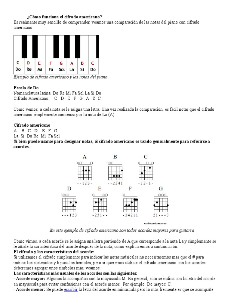 Tenemos muchos acordes con sus variables pero aqui senalamos los mas basicos. En cifrado americano los acordes con septima mayor llevan el sufijo maj7 al lado y los acordes con septima menor el sufijo 7 a secas. Esto es y asi se lee. El cifrado en la musica hace referencia a los sistemas de notacion y nomenclatura que utilizan signos de cifras y por extension de letras para expresar los fenomenos sonoros.