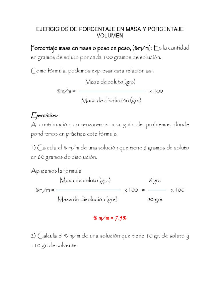 Calcular el porcentaje en volumen de una disolucion de 200 cm 3 de acido sulfurico h 2 so 4 en una disolucion con 2 kg de agua. Porcentaje en volumen es una expresion comun para especificar la concentracion de una solucion. Su formula es la siguiente. El porcentaje en masa representa la cantidad de soluto que se encuentra contenida en 100 unidades de masa de disolucion.