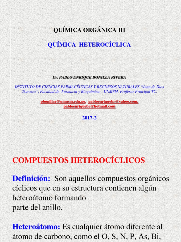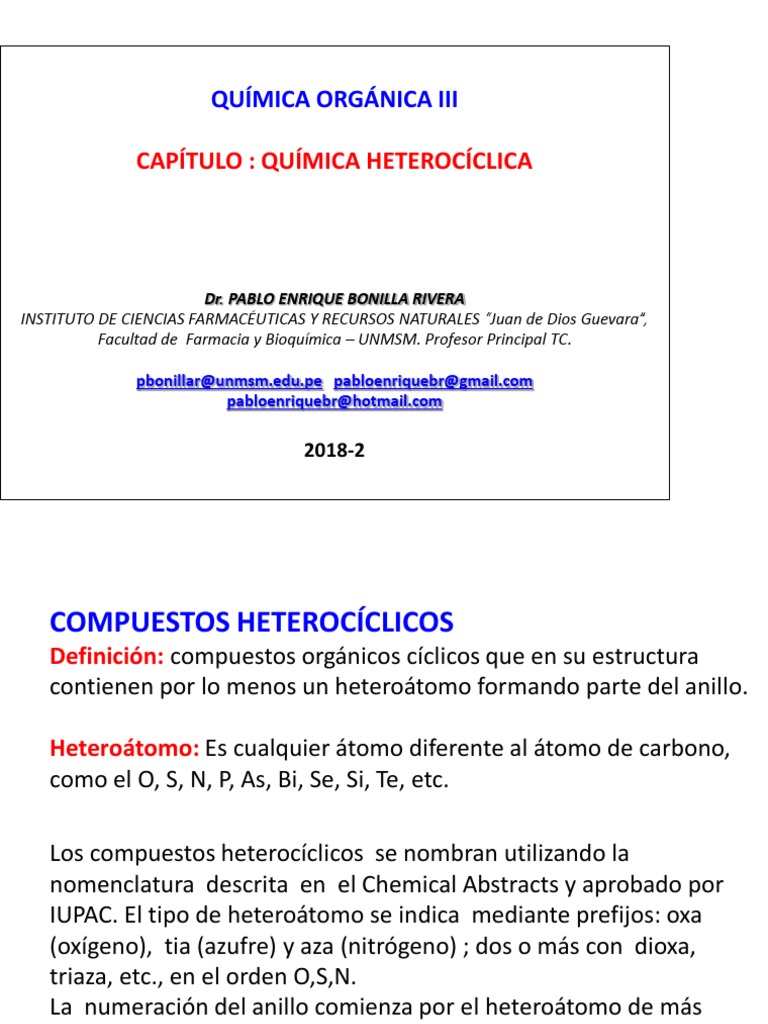 El orden en el que estos se ponen es inverso al que tienen en la tabla periodica los grupos. Vii f antes que vio antes que vn. Importance in nature and in the synthesis of pharmaceuticals. Objetivo general de la materia el objetivo general de esta materia es proporcionar al estudiante los conocimientos basicos sobre la quimica de los compuestos heterociclicos.