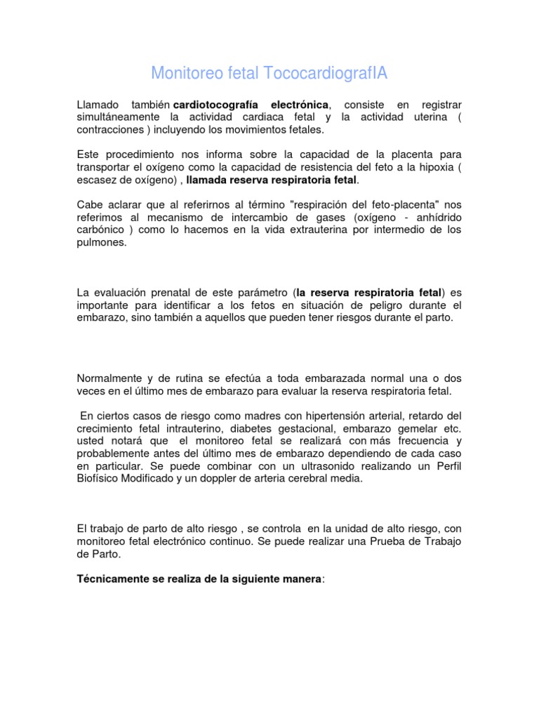 Que es monitoreo en el embarazo. Para motivar los movimientos fetales es probable que sugieran a la embarazada ingerir algo dulce media hora antes de realizar el monitoreo. Que es y en que consiste la prueba de la monitorizacion fetal. Si los medicos durante el parto creen que los latidos del corazon del bebe necesitan ser examinados mas de cerca podra llevarse a cabo un monitoreo fetal interno. Introduccion el monitoreo fetal es una prueba de bienestar fetal para la prevencion de morbi mortalidad del producto.