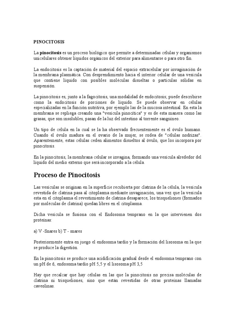 La pinocitosis es un proceso en el que una celula absorbe o engulle particula a su interior. 1 con desprendimiento hacia el interior celular de una vesicula que contiene liquido con posibles moleculas disueltas o. Proceso es un tipo de endocitosis que consiste en la captacion de material del espacio extracelular por invaginacion de la membrana citoplasmatica eucariota. La pinocitosis es un proceso biologico que permite a determinadas celulas y organismos unicelulares obtener liquidos organicos del exterior para ingresar nutrientes o para otra funcion.