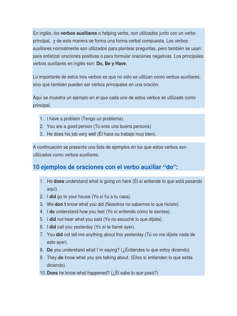 Que es un verbo auxiliar en espanol. Se utilizan en combinacion con verbos principales para formar oraciones negativas e interrogativas asi como tiempos compuestos continuos o perfectos y la voz pasivalos verbos be do have y will tambien pueden funcionar solos como verbos principales con un significado. Los verbos auxiliares son verbos que proporcionan informacion gramatical y semantica adicional al verbo principalel verbo auxiliar se combina con otros verbos en la formacion de los tiempos compuestos de la voz pasiva y de la perifrases verbales. El verbo haber se usa para formar los tiempos compuestos. En espanol solo existe un verbo que es siempre auxiliar.