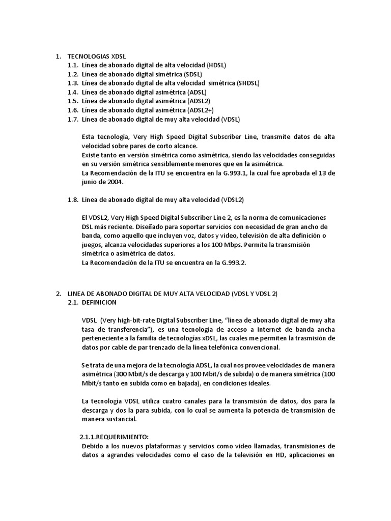 Que es xdsl. Convierte el par de cobre que va desde la central telefonica hasta el usuario en un medio para la tansmision de aplicaciones multimedia hdsl. Las cuatro tecnicas dentro de la familia xdsl adsl. La tabla 1 que se muestra es una breve comparacion de algunas de las variantes de xdsl basada en sus caracteristicas y aplicaciones. Cada tecnologia xdsl se diferencia por sus caracteristicas tecnicas como el tipo de modulacion utilizada y la banda de frecuencias ocupada.