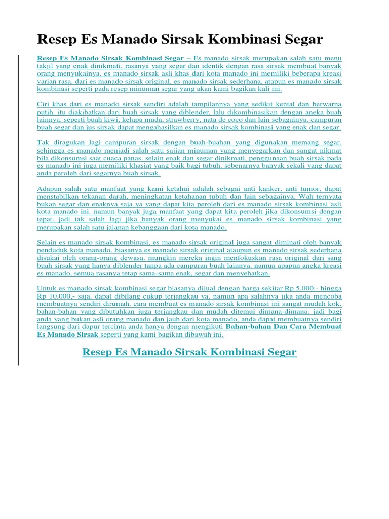 Resep es manado spesial sirsak adalah masakan es yang menggunakan saus buah sirsak. Lihat juga resep es manado sirsat ala ala enak lainnya. Resep es manado merupakan sekumpulan bahan dan panduan membuat es khas manado. 73 resep masakan rumahan yang mudah dan enak.